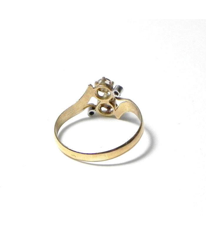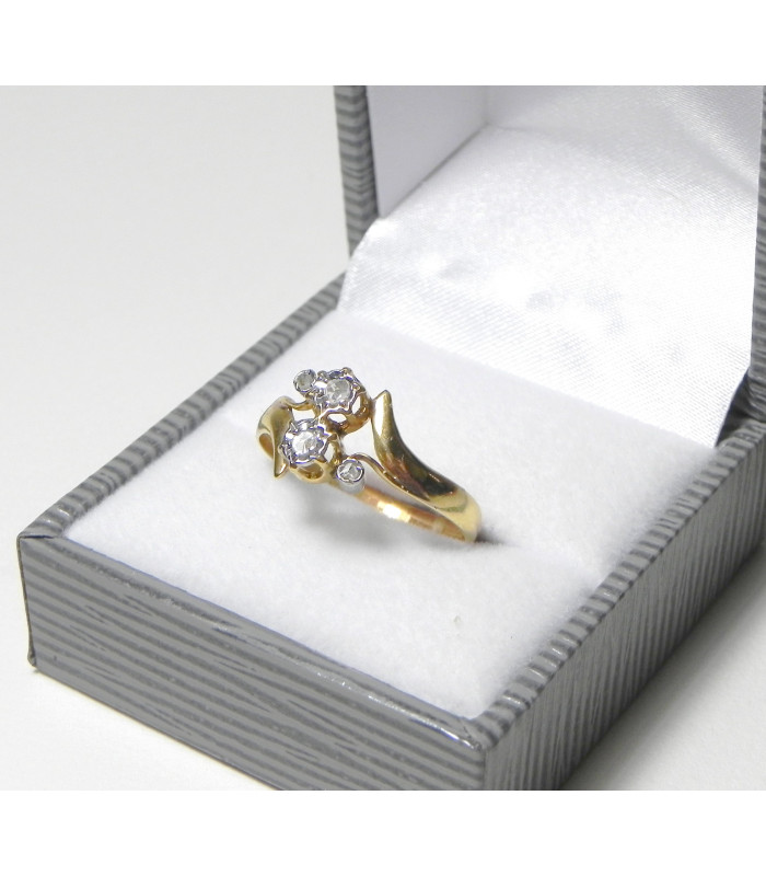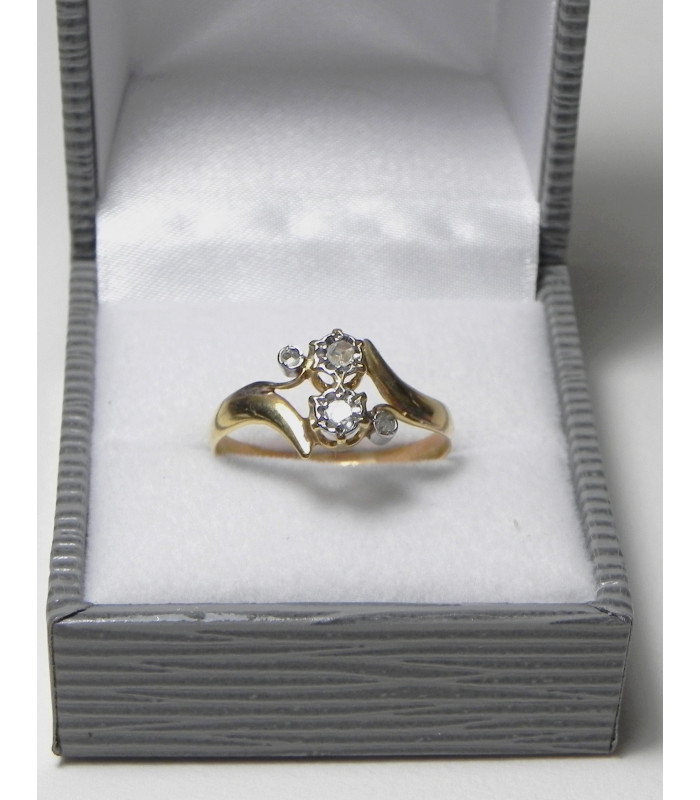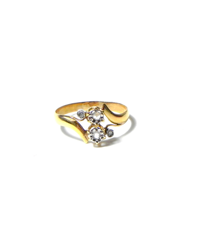 "ADELE" "Vous et moi", bague fin XIXème en or jaune et gris 750°/°° (18 kt) sertis effet 4 diamants taille rose de Provence - longueur du motif sur le dessus du doigt : 9 mm / Anneau demi-ruban au N° 59 -Mise à taille à + ou - 3N°- PB 2,4 gr- Douce patine parfait état !