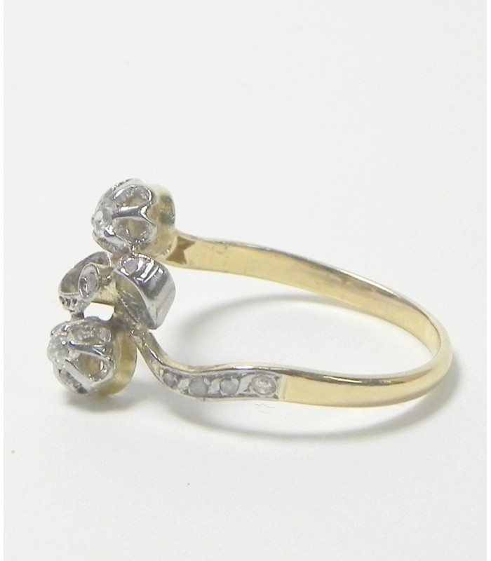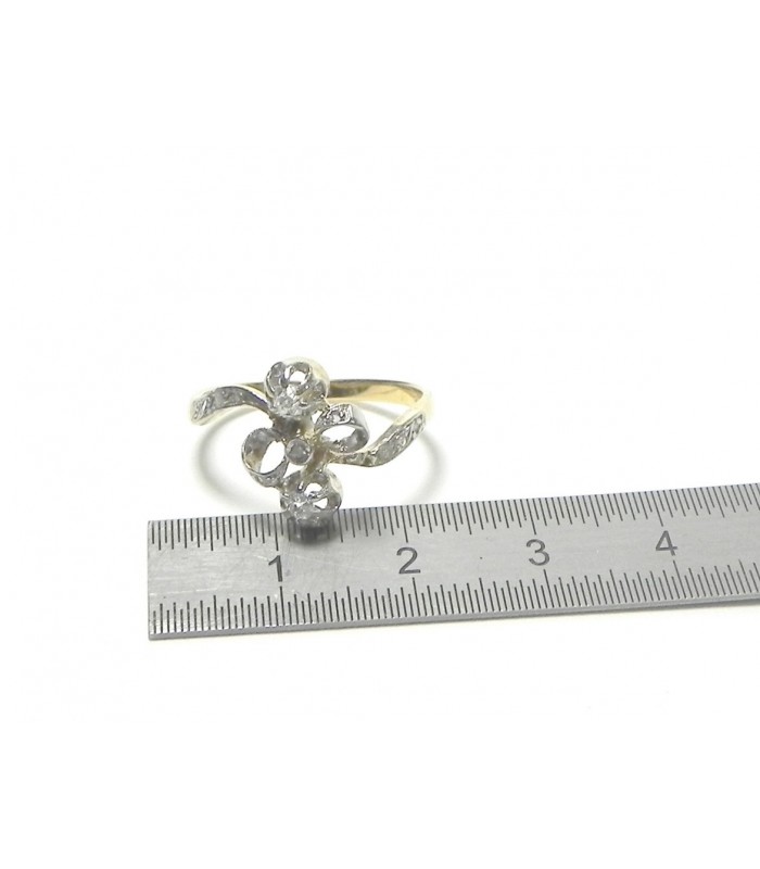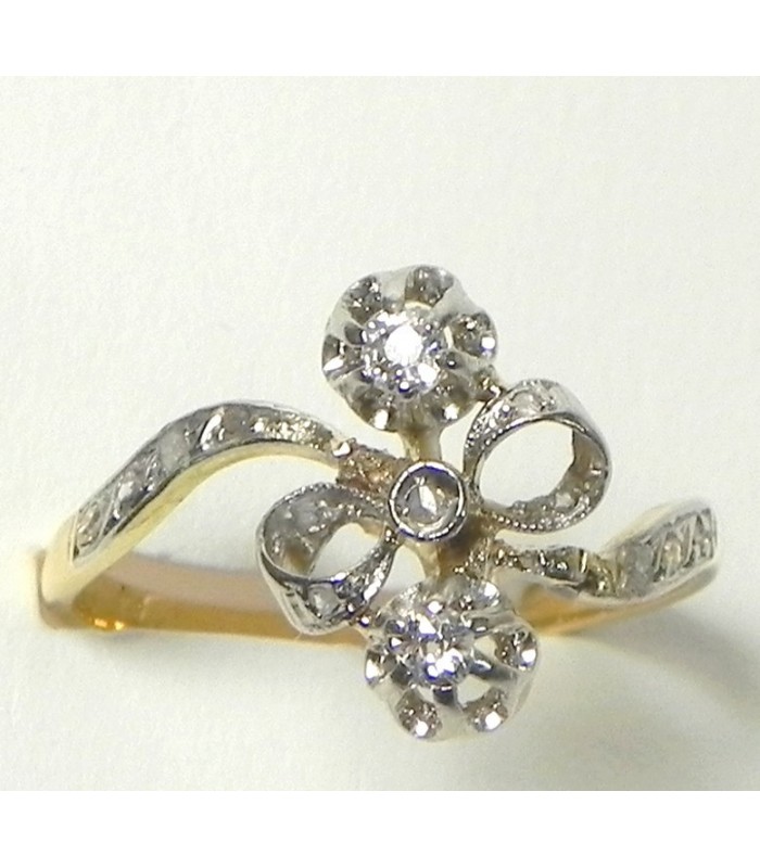 Charmante bague ancienne dite Lavalière formée d'un nœud - Sertis sur griffes deux diamants ancienne taille d'environ . 0,10 ct chacun, diamants taille rose sur l'anneau et le motif . Or jaune 750 (18kt) platine - Longueur du motif sur le doigt 15mm largeur 8mm - Tour de doigt au n° 56/ US 7,5 - PB 2,98 g- Patine d'usage . Mise à taille jusqu'à plus ou moins 3 numéros-