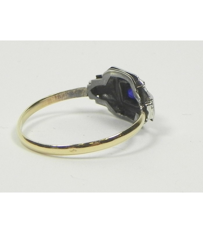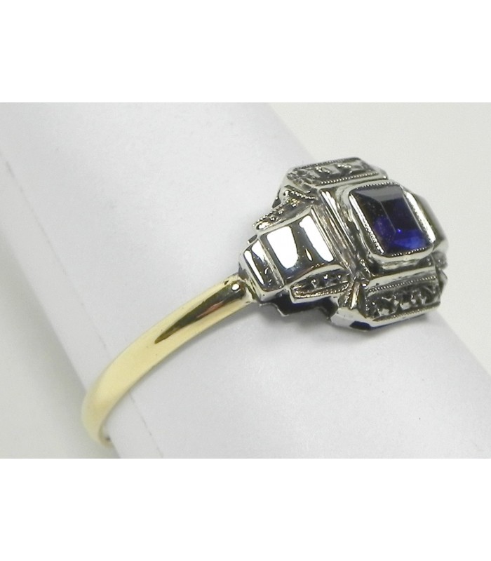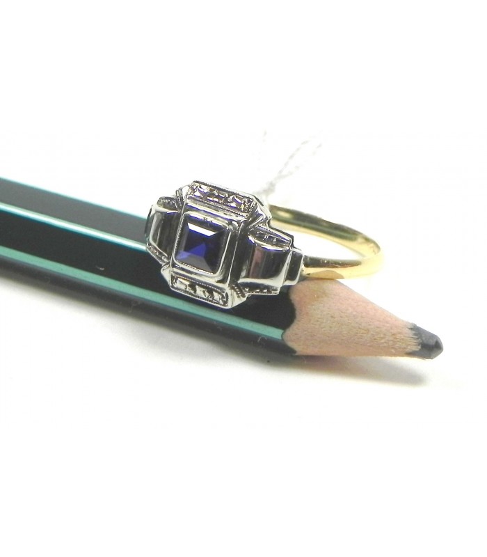 Petit bague romantique de la fin des années 40, anneau en or 750°° (18 kt) plateau à gradin (largeur 9 mm)en argent décoré de ciselures, serti en carré une pierre bleu (imitation)-Tour de doigt N° 54/ US 6,75- PB 1,4gr (belle patine du temps)
