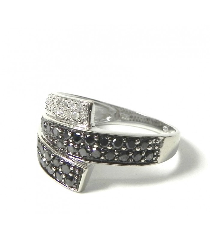 Bague moderne or 750 rhodié, diamants blancs et noirs
