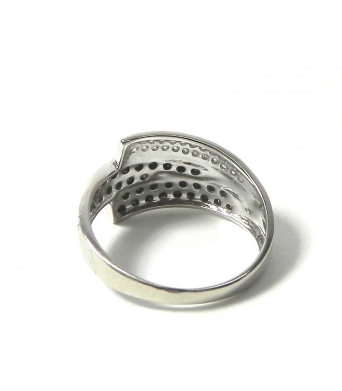 Bague moderne au design épuré en or 750 (18 kt) rhodié, pavage sur trois liens de 24 diamants blancs totalisant environ 0,20 carats et 36 diamants noirs totalisant environ 0,7 carats.PB 3,20 gr - Tour de doigt N° 54/US N° 6,6 -Attention les diamants étant sertis dans le corps de bague, il n'y a pas de mise à taille pour ce produit!