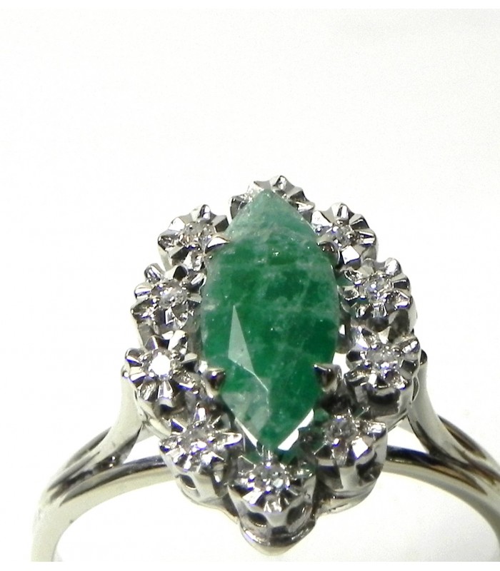 Typique des années 80, bague marquise monture panier "fil" or gris 750°° (18 kt) émeraude taille navette 10,1x4,7 mm (environ un carat) sertie par 4 griffes, entourée de 10 diamants taille 8X8 sur serti "effet" - PB 3,9 gr - Tour de doigt au N° 53/US N° 6,25 - attention, pas de mise à taille sur ce produit ! Petit prix !!!
