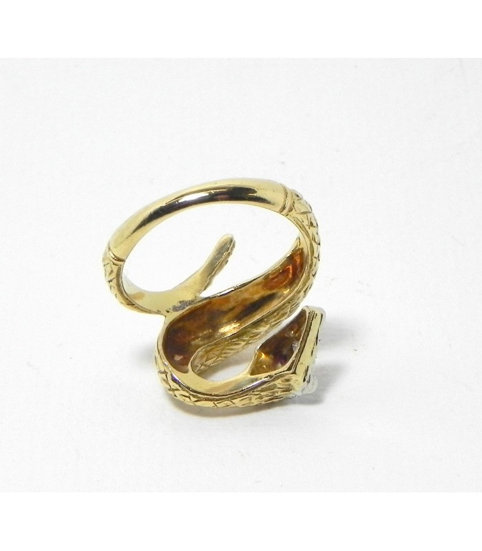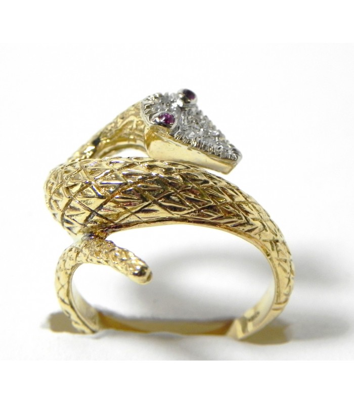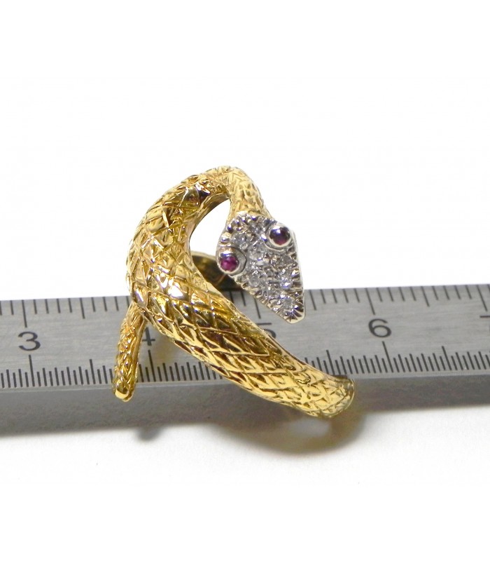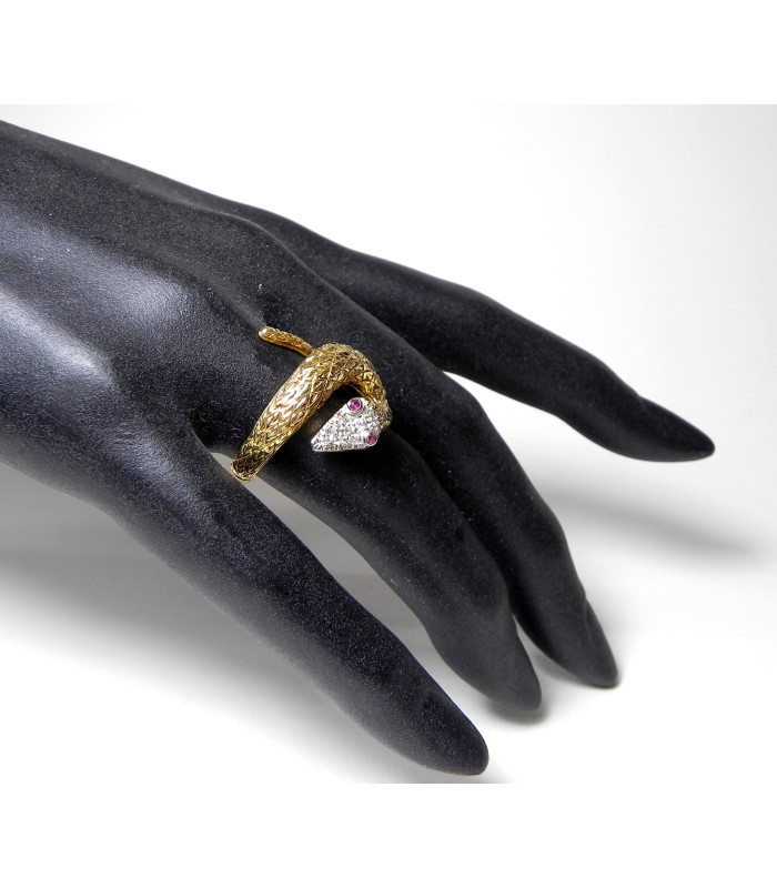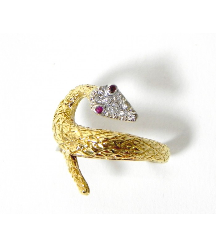 Beau travail de ciselures pour les écailles en relief de cette bague serpent en or jaune 750 ( 18 kt ) la tête pavée de 9 diamants (environ 0,10 carat) sur or rhodié et les yeux en rubis - Longueur sur le doigt 20 mm- Tour de doigt au n° 55 - mise à taille + ou - 3 numéros - PB 8,3 gr- Bijou de qualité peu courant !